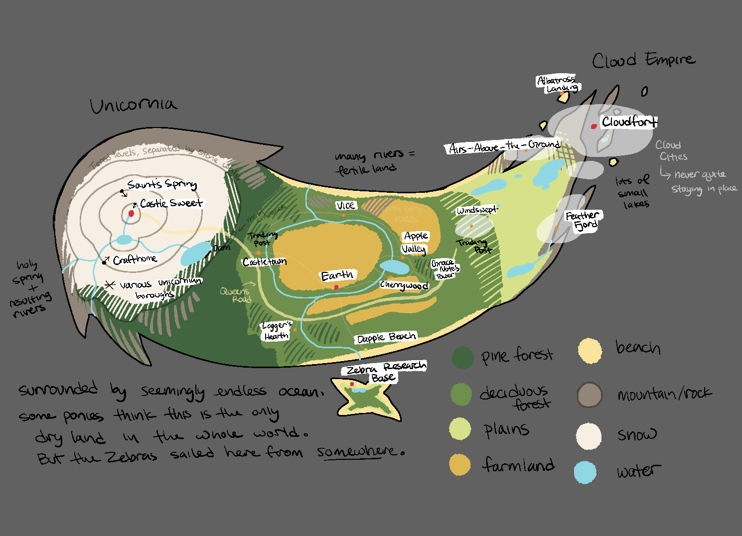 The western end is taken up by a large, snowcapped mountain. This is Unicornia. Most of the mountain is covered with buildings and it is surrounded by a stone wall at its base. Past the wall is dense pine forest, which gradually thins out and transitions into deciduous forest as the elevation drops.